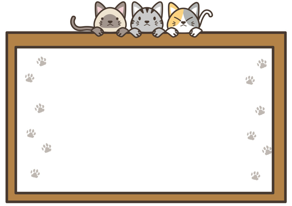 社内やお店の掲示物やお知らせの張り紙などで使用するテンプレートにおすすめの飾り枠です。3匹の猫がフレームに手を掛けているかわいいデザインと猫好きにはたまらない肉球のイラスト入りです。ZIPファイルにはPDF/JPG/透過PNG/AIが含まれておりお好きなものをご利用いただけます。