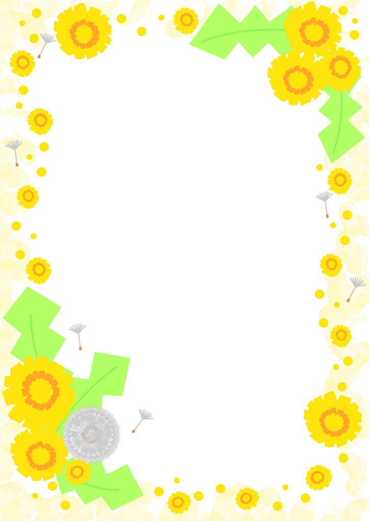 幼稚園や保育園で使いやすい「タンポポの花」手書き風のイラストフレーム・おたよりや文集素材におすすめのかわいいタンポポの花のデザインです。幼稚園・保育園の配布するおたよりやプリント、壁などに張り出すお知らせなどに利用しやすいフレーム素材となります。ダウンロード後にご利用ください。