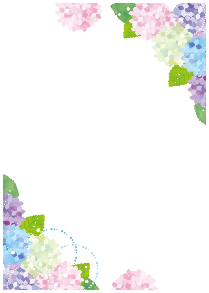 6月の梅雨の時期に満開の花を咲かせる紫陽花の花を使った縦型のフレーム素材になります。紫陽花の花を上下斜めに配置して中に入れるテキストの邪魔をしないように作りました。6月や梅雨のお知らせ、ポップ、お礼状、お手紙、お便りなどの便箋としてなど、幅広くご利用いただけます。