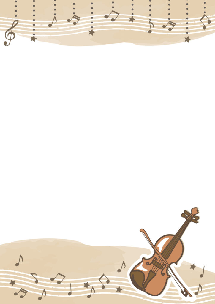 上品でかわいいバイオリンのイラストが印象的な飾り枠。ブラウン系で構成されており、秋の音楽発表会の案内や式次第のフォーマット・楽譜カバーとしておすすめします。音譜の中に星が混ざって楽しそうな雰囲気も伝わるデザインとなっております。透過PNG、JPG、イラストレーター、PDFの全てをご利用頂けます。