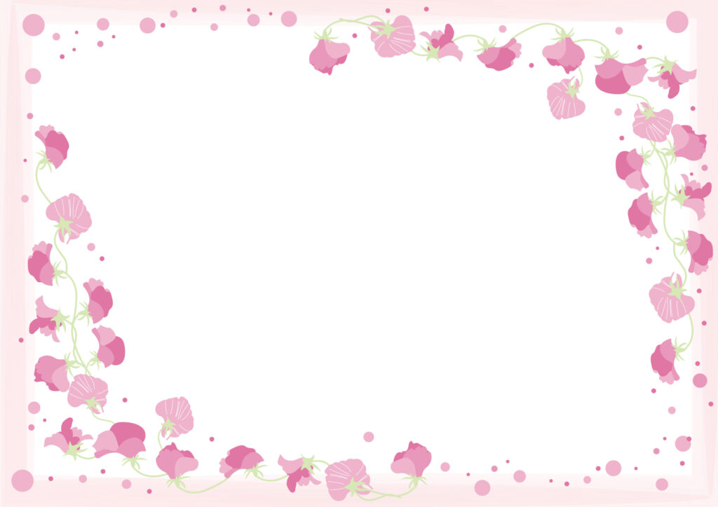 横型のピンクが可愛い!スイートピーのフレームで回覧資料やチラシ素材に使えるイラストで、スイートピーの可愛い花が描かれております。飾り枠となりますので、子供会の回覧資料や配布物・お店で作るチラシや張り紙、お知らせのデザインなど色々な用途で利用可能です。