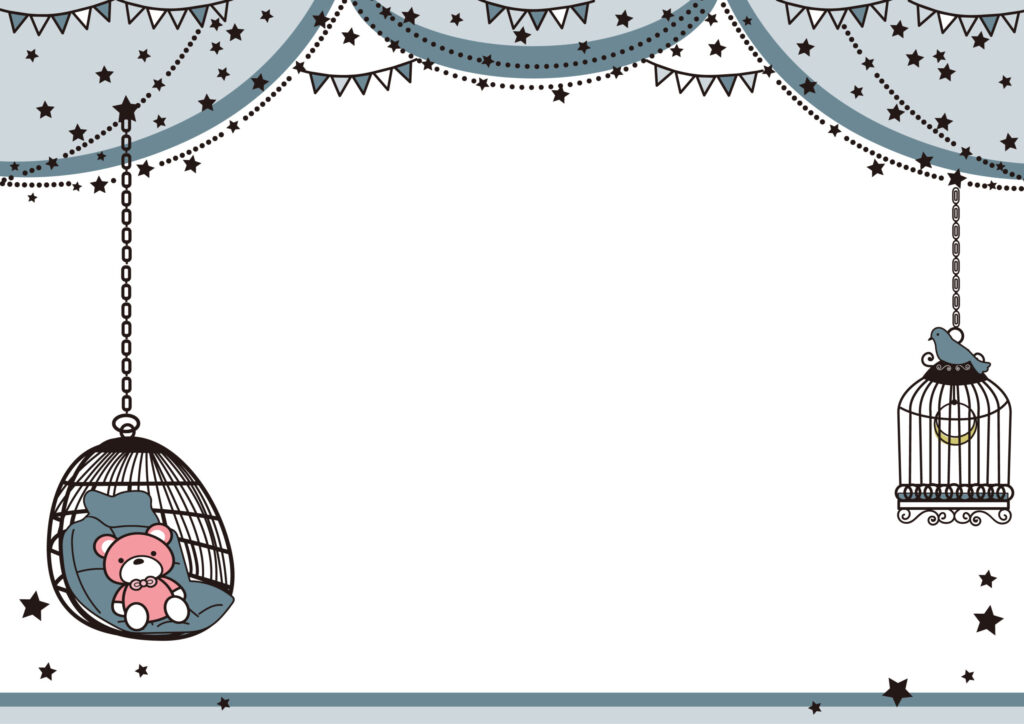 絵本みたいなガーランドのフレーム!鳥かご・くまのぬいぐるみがかわいいデザインのイラスト♪雑貨店の張り紙に!星のガーランドとハンギングチェアに乗ったくまのぬいぐるみや鳥かごが、まるで絵本の1ページのようなかわいいデザインの飾り枠です。ダウンロードが可能で雑貨店やカフェのPOPや張り紙などにおすすめです。