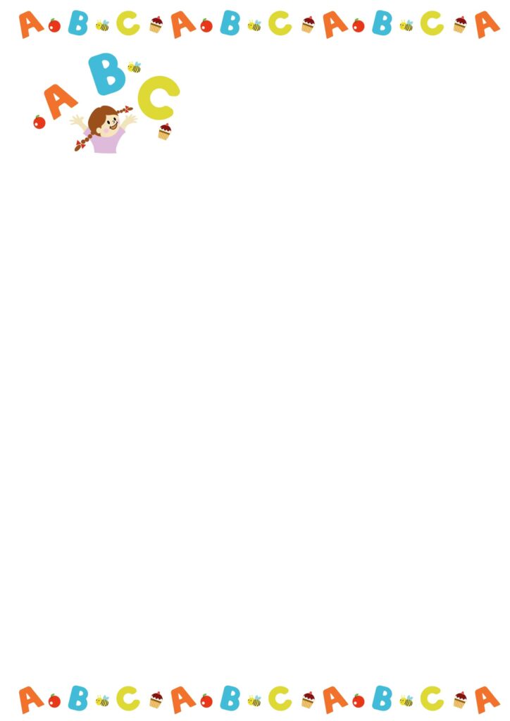 ABC英語フレーム☆英語教室、幼児スクール、学校の英語授業におすすめのかわいいABCのイラストのフレームです。教室内に掲示するPOPやレッスンスケジュールの張り紙、無料体験教室のお知らせの作成などにおすすめのテンプレートになります。