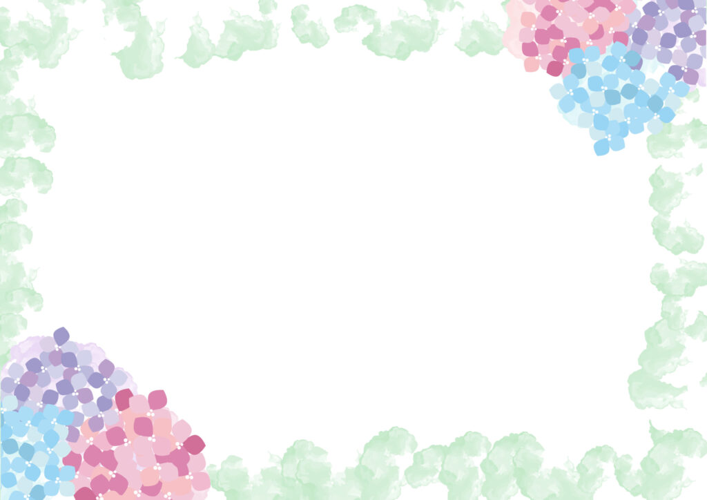 ピンク、水色、紫の紫陽花のイラストがかわいいデザイン入りフレームになります。梅雨のシーズンのお便りや掲示物のテンプレートとして、幼稚園や小学校、行政、病院などでいかがでしょうか。長雨で沈んだ気持ちを晴れやかにしてくれる色合いでおすすめします。ダウンロード後に利用可能です。