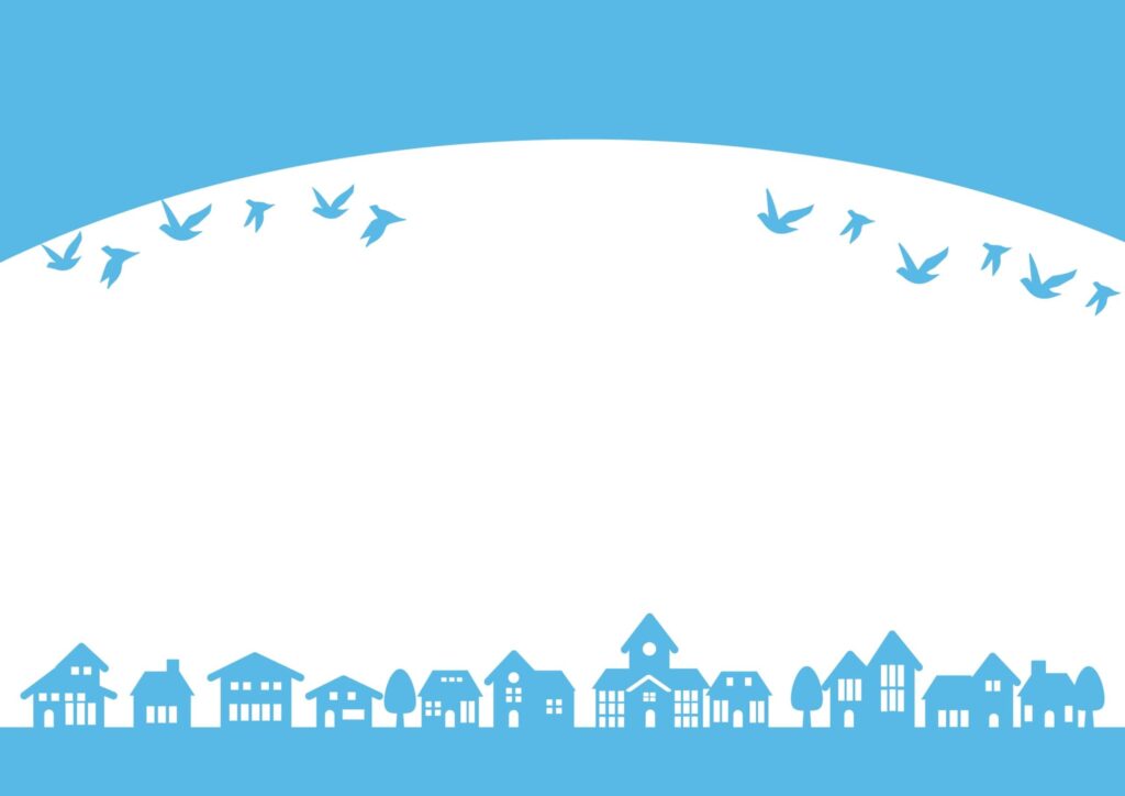 平和な街並みの様子と空に羽ばたくかわいい鳥の背景イラストです。単色のシルエットで描かれたおしゃれな街並みと、アーチ型の空のフレームが特徴で優しく柔らかい印象のテンプレート。お店のPOPや張り紙のフォーマットとして、動画やスライドの挿入画像としてもおすすめします。