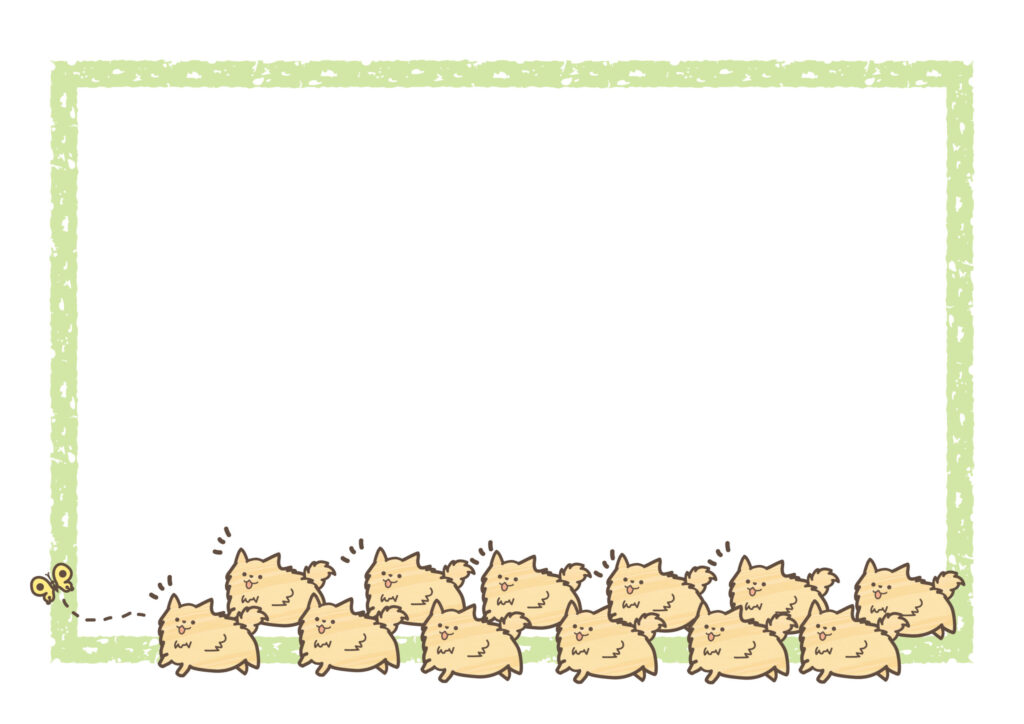 ポメラニアンのようなかわいい子犬たちがみんなで蝶々を追っかけている様子を描いた、微笑ましいデザインの飾り枠です。優しいグリーンのフレーム、目に留まりやすい微笑ましいイラストは、壁に貼るポスターやチラシのテンプレートとしても使えます。中に文字を記入するだけで、簡単に作成できます。
