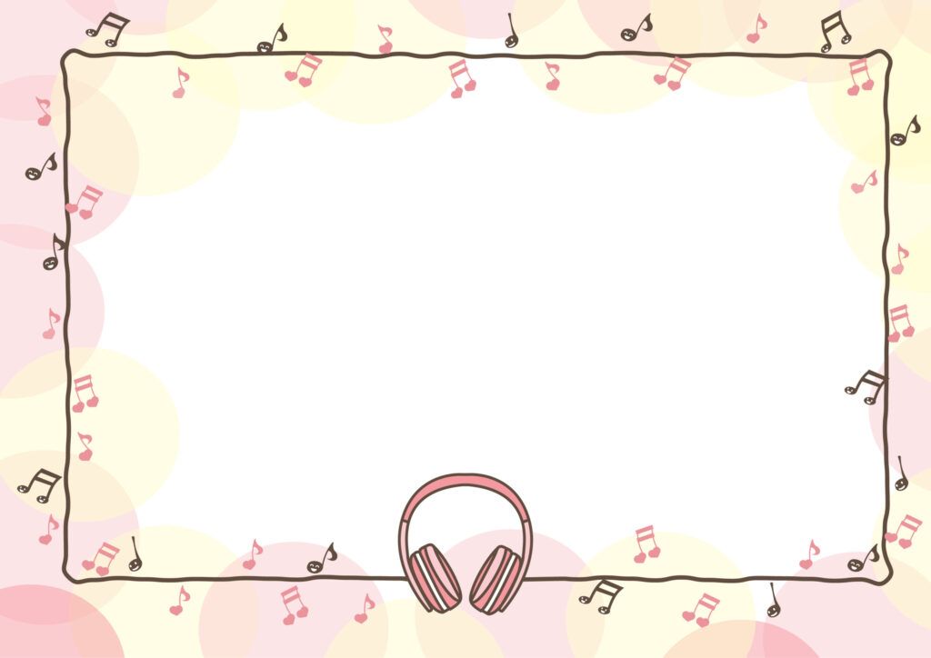 ヘッドフォンから音楽が流れているような演出で音譜でフレームを作りました。淡いピンクと黄色の円で柔らかな雰囲気もある、おしゃれでかわいい飾り枠のテンプレートです。手紙、メッセージカードやフォトブックにもご利用いただけます。若い女性に人気のあるデザインなのでティーンエイジャーをターゲットにしたお店のPOPにもおすすめします。