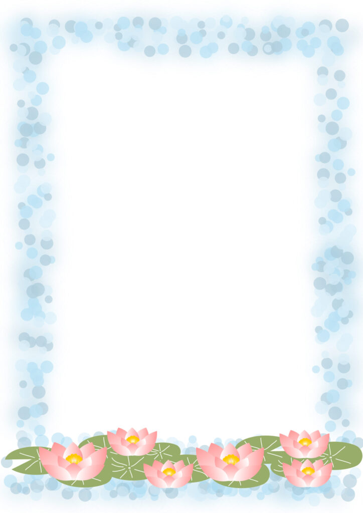水面に蓮の花が綺麗に咲いているイラストデザインのフレームドット柄が梅雨の時期をイメージした素材となります。蓮の花が水面に浮かんでいるデザインが非常にオシャレな素