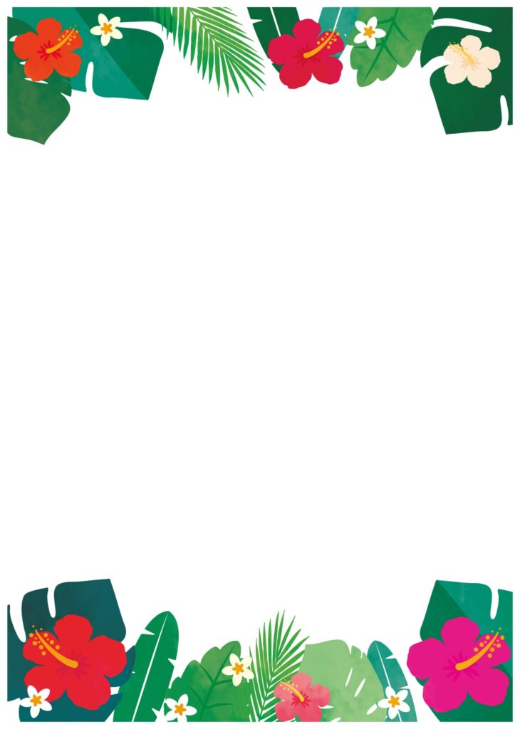 ハイビスカスとモンステラの葉っぱで作った縦型の飾り枠素材です。プルメリアの小さなかわいらしい花も混ぜたトロピカルな夏のイラストで上下をデザインしました。暑い夏にピッタリの常夏フレームです。7月、8月のお知らせやお便り、お手紙、また暑中見舞いなどにもぜひご利用ください。