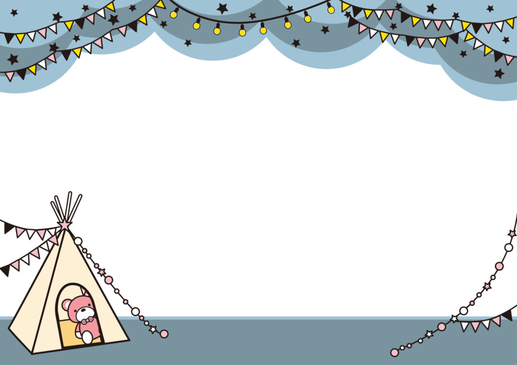 おしゃれなガーランドライト・テント・くまのぬいぐるみのフレーム☆子供向けキャンプや合宿のしおり・資料・お知らせに!A4横型サイズでアウトドアグッズには欠かせない