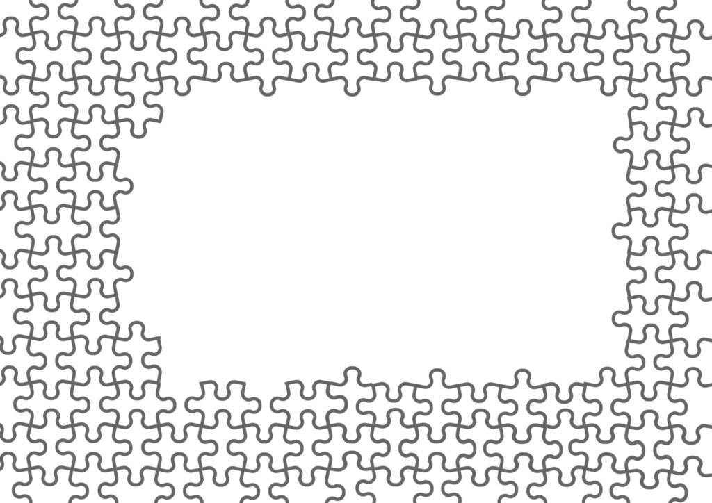ジグソーパズルのイラストのフレーム!おもしろいモノクロデザインでフォトフレームも作れる透過png!インパクトのあるおもしろいフレームをお探しの方みに必見の「ジグソーパズル」のイラストフレームです。メッセージカードや自宅や会社で使用する伝言メモ帳の飾り枠にいかがでしょうか。ダウンロードですぐにご利用が可能となっております。