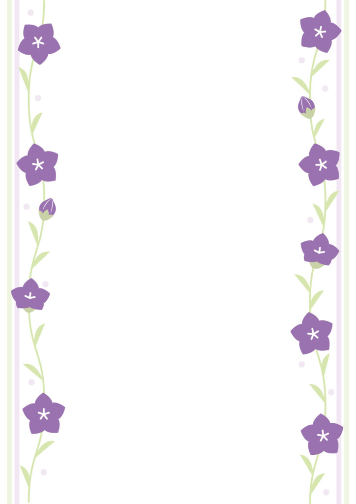 6月から秋までの花「桔梗(キキョウ)」のフレーム素材で枠にイラストでデザインのテンプレートです。星型の花がオシャレで可愛らしいデザインですので、手紙を出す時の便箋としても利用可能です。基本サイズがA4想定ですが、サイズ調整しハガキなどのデザインやメッセージカードとし利用する事も出来ます。