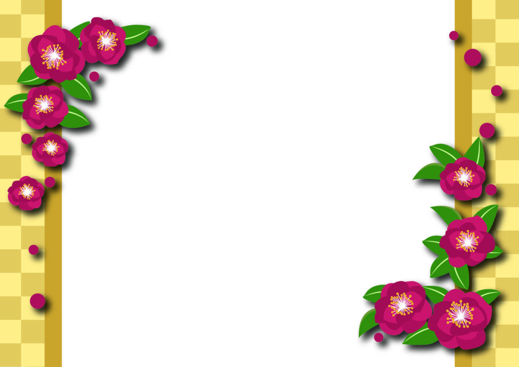 深紅の「山茶花」が可愛くイラストで描かれた飾り枠で華やかなデザイン!お祝いの素材におすすめのテンプレート素材となります。山茶花の開花時期は10月から12月頃とな