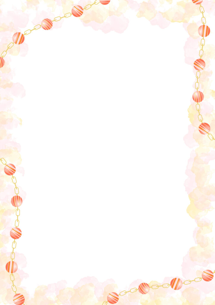 8月の誕生石「サードオニックス」というかわいい赤い宝石ををネックレス型にデザインし、フレームのようにあしらった、おしゃれな飾り枠です。ダウンロード後、既存の原稿に飾り枠を付けたり、直接文字を書き込むことが可能です。