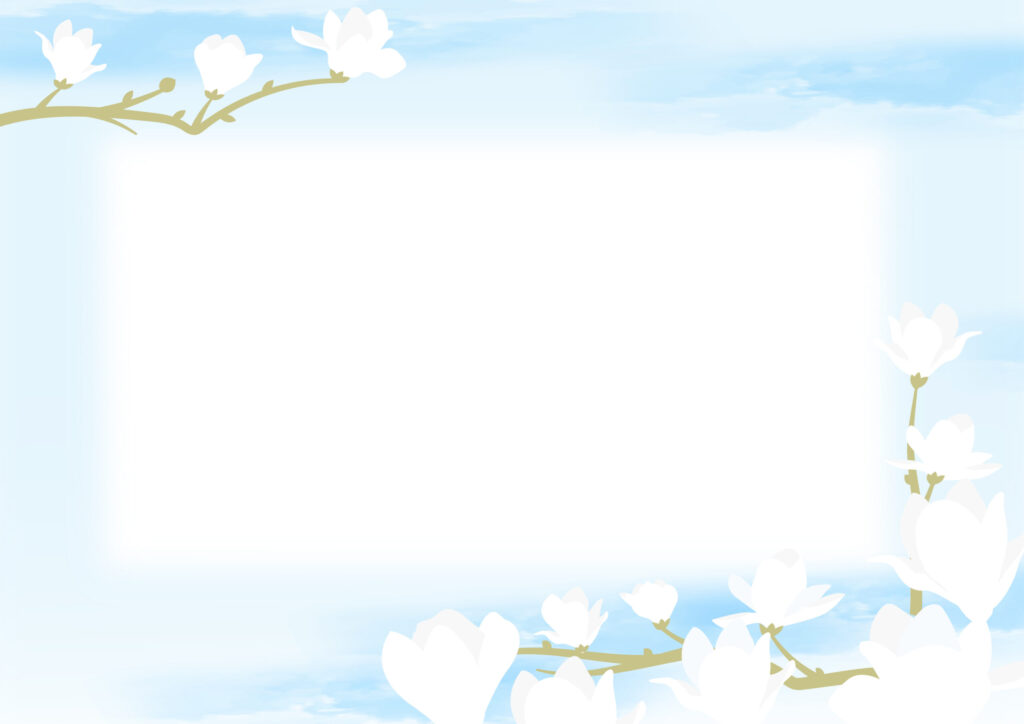 木蓮の花のイラストがデザインされたフレーム素材(A4サイズ・透過PNG・JPG・PDF)テンプレートでダウンロードする事で全ての素材がご利用頂く事が出来ます。行事カードや啓発ポスターやお店で作成するPOPなど様々な用途で利用が可能です。行事カードにする場合は開花時期に合わせて利用するのがおすすめです。