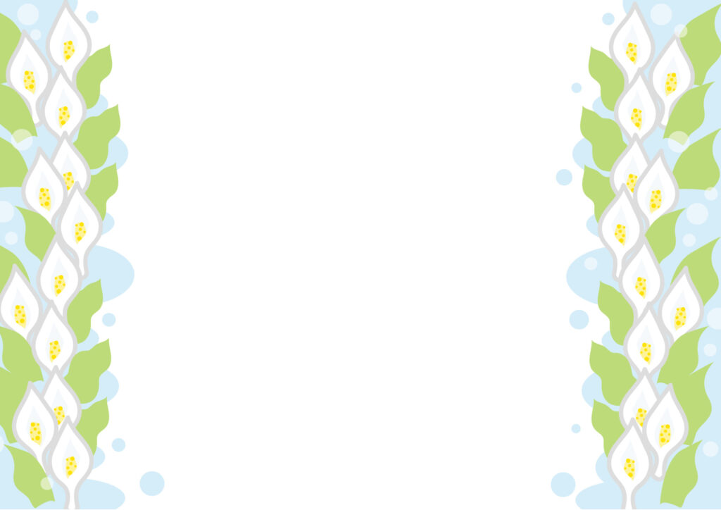 6月の季節の花「水芭蕉」白の花と緑の葉っぱのイラストフレームでA4サイズの横型シンプルなデザインの素材となります。ダウンロードで使用出来るテンプレートですので、
