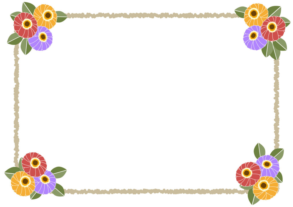ビビットな花色が特徴の「ジニア」の花をコーナーに描いたフレームです。「ジニア」の和名は「ヒャクニチソウ(百日草)」と言い、名前の通り長い期間、開花をし楽しませてくれるお花です。真夏の太陽の陽射しにも負けず、元気に咲く様子から元気がもらえるイラスト。