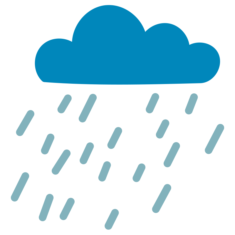 濃い水色の雨雲から、水色の雨粒が降っている様子を描いた、天気予報や気象をテーマにしたイラストアイコンです。雨天、梅雨、悪天候、降水といった天候に関する情報を視覚的に伝えるのに役立ちます。アプリのUIデザイン、ウェブサイトの天気情報セクション、印刷物の説明図など、汎用性の高いシンプルなアイコン素材です。