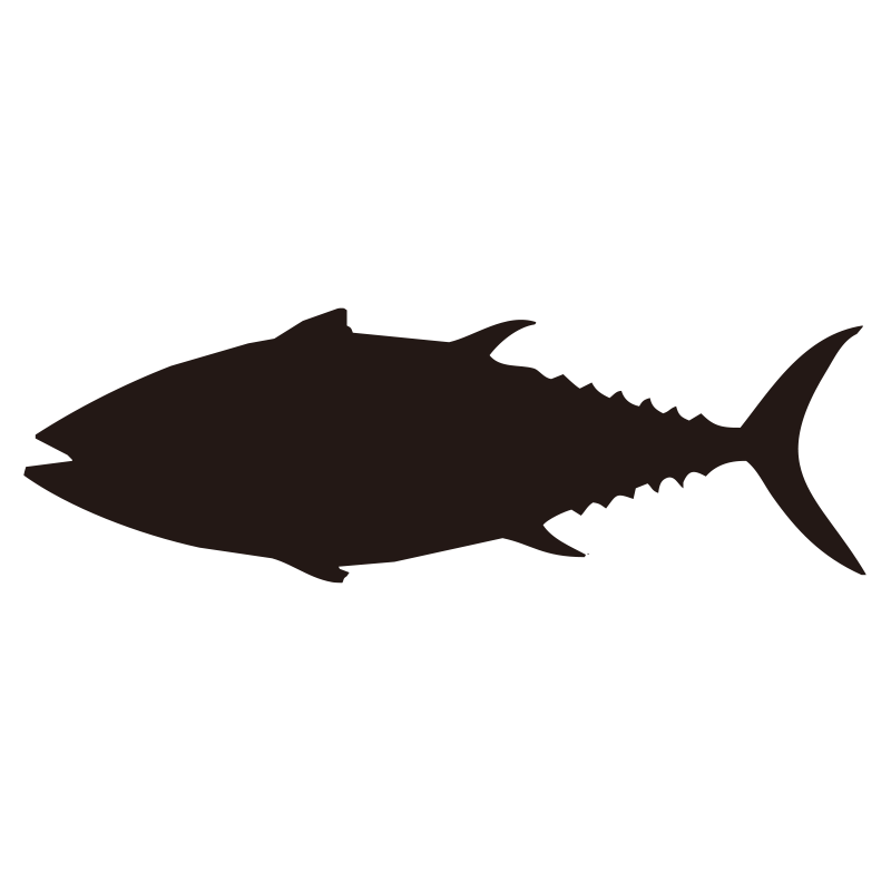 力強く泳ぐマグロの横顔を捉えたシンプルなシルエット素材。魚介類、水産資源、寿司、あるいは大海原を回遊するエネルギーを表現するアイコンとして幅広く活用できます。スーパーのチラシ、魚屋のロゴ、和食のメニューデザインなどに使いやすい形状です。