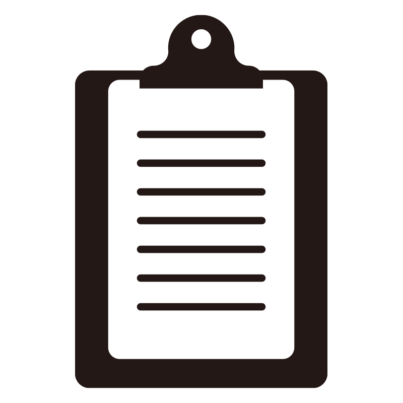 用紙を挟んだクリップボード(バインダー)のシルエットアイコンです。アンケート、問診票、チェックリスト、業務管理、事務作業などをイメージさせます。医療、ビジネス、