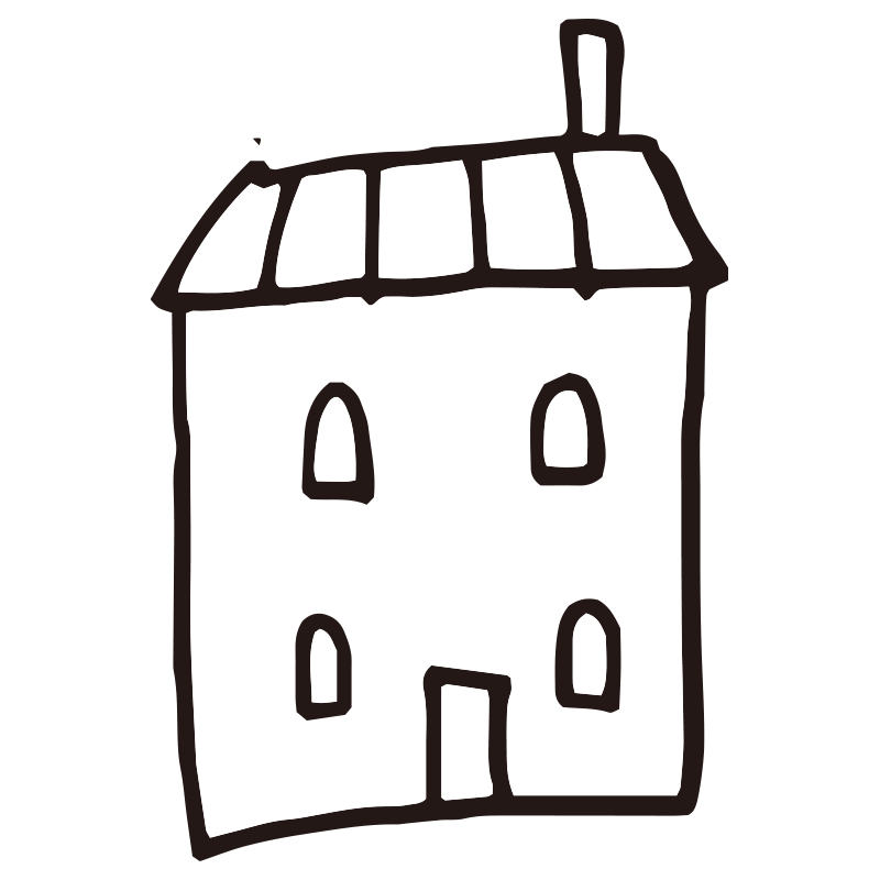 手書き風の温かみがある、煙突のついた二階建て住宅のイラスト素材です。シンプルで素朴な線画が特徴で、マイホームの購入やリフォーム、不動産広告のワンポイント、ファミ