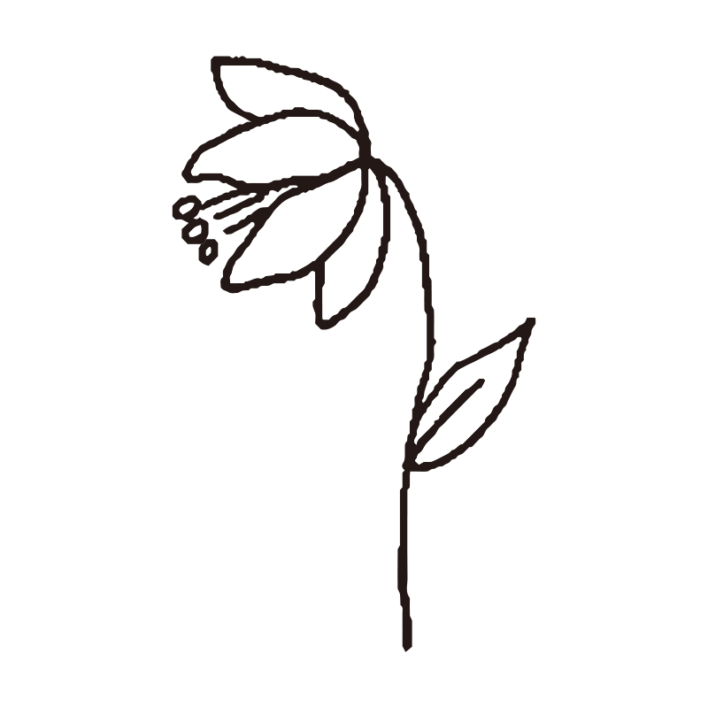 一輪の可憐な花が茎に咲いている様子を描いた、手書きタッチのイラスト素材です。下向きに咲く花のフォルムが特徴的で、優しさと静かな雰囲気を演出します。サンキューカード、手紙のワンポイント、オーガニック製品のパッケージデザインなどの装飾に使いやすいデザインです。
