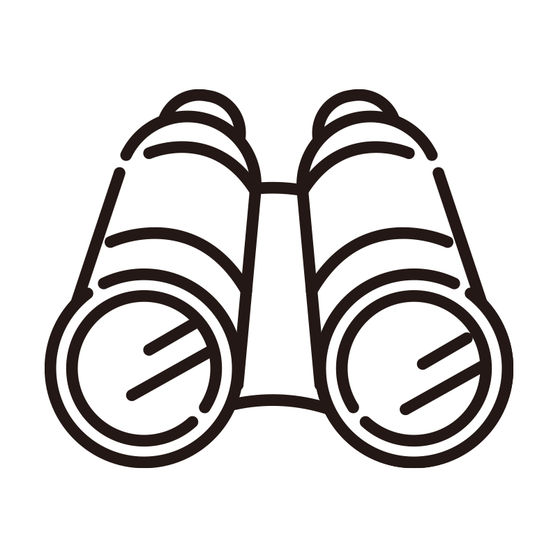 アウトドアやバードウォッチング、スポーツ観戦などのシーンで活躍する双眼鏡のシンプルな線画イラストです。アイコンとしても使いやすい太めのラインで構成されており、キャンプや旅行のしおり、探検をテーマにしたデザインに最適です。