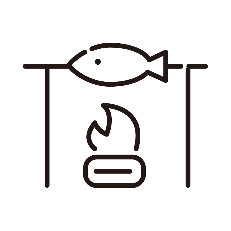 キャンプの醍醐味である焚き火で、串に刺した魚を焼いている様子を描いたコミカルな線画イラストです。野外調理やサバイバル、アウトドアレジャーの楽しさを伝えるデザイン