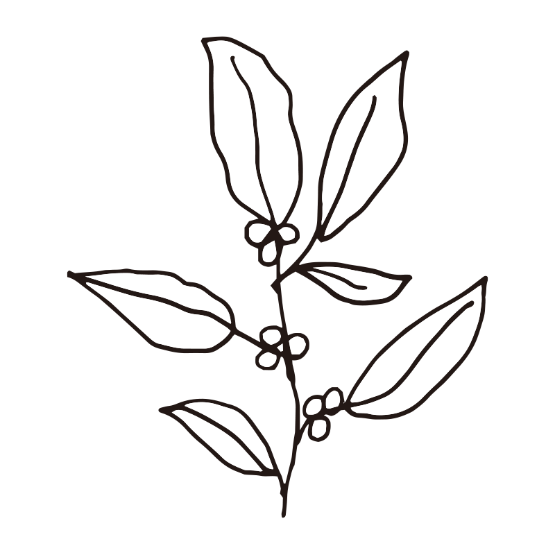 複数の葉と小さな丸い実のような蕾がついた植物の枝を描いたボタニカルな線画イラストです。手書き風のナチュラルなタッチが特徴で、オーガニック製品のパッケージデザイン