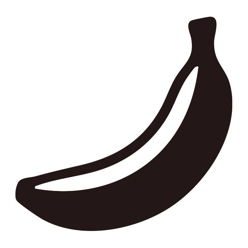 皮をむく前のバナナを一本描いた、滑らかなカーブが特徴的なフルーツのアイコンイラストです。一目でバナナと分かるシルエットは、果物の紹介、朝食のイメージ、栄養に関す