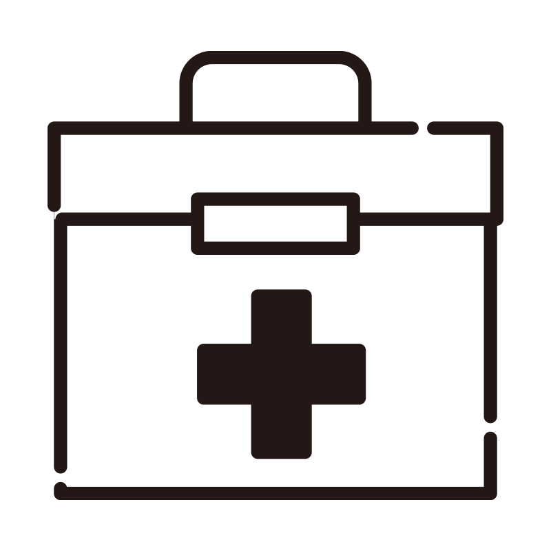 中央に大きく十字のマークが入った、取っ手付きの救急箱のアイコンイラストです。医療、ヘルスケア、応急処置といったテーマを直感的に伝えられるデザインで、防災グッズのリストや病院のウェブサイト、安全衛生に関する案内表示などに適しています。