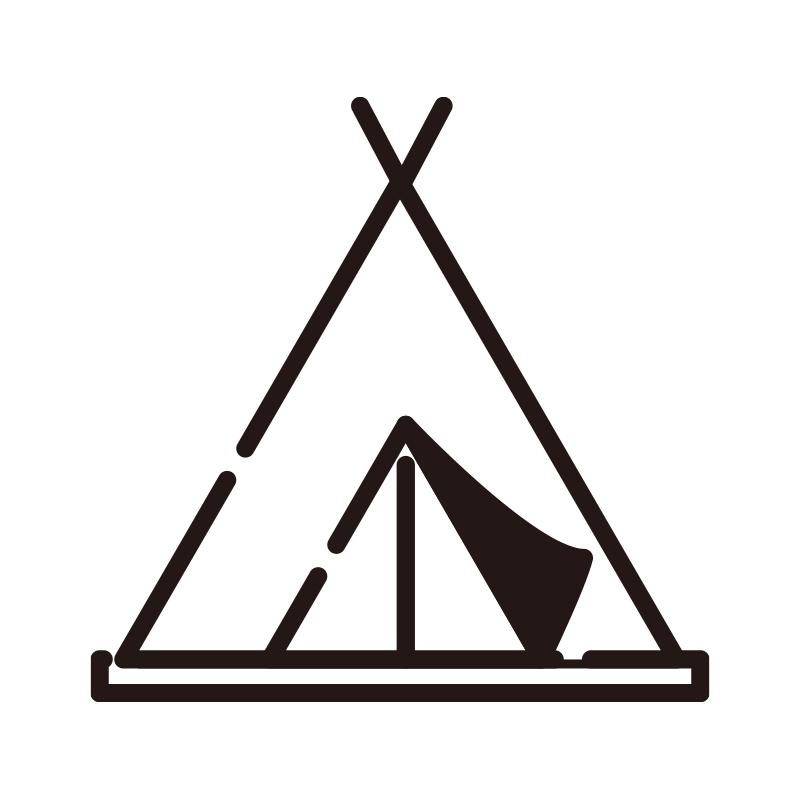 円錐形のシルエットがおしゃれな、ティピー型テントのアイコンイラストです。グランピングやソロキャンプ、インディアンスタイルなど、近年の流行を取り入れたスタイリッシュなアウトドアシーンや、秘密基地のようなワクワク感を表現できます。