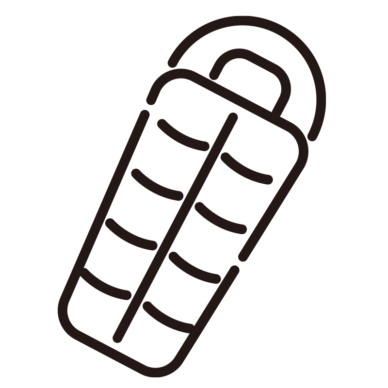 身体の形にフィットするマミー型の寝袋(シュラフ)を描いたアイコンイラストです。キャンプや登山での宿泊シーンはもちろん、防災グッズのチェックリストや車中泊の案内な