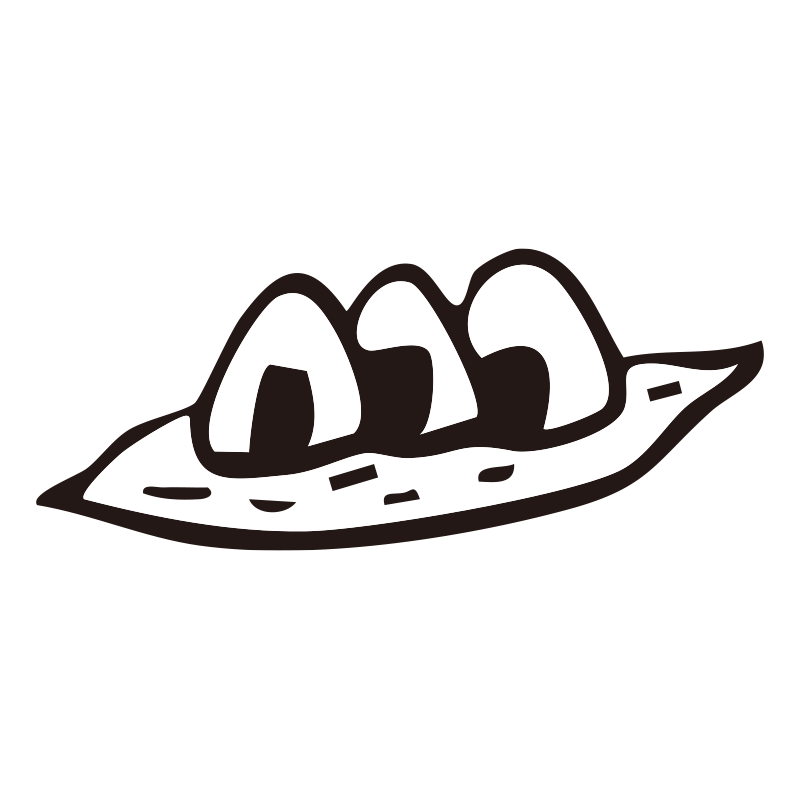 竹皮のような敷物の上に、3つの小さなおにぎりが並んだ温かみのある手描き風イラストです。ラフな線画で描かれており、和食、お弁当、遠足、ピクニックといった「食」にまつわるシーンを優しく彩ります。手作り感を出したい料理ブログのアイキャッチや、飲食店のメニュー表、手描きPOPのワンポイント装飾として特におすすめの素材です。