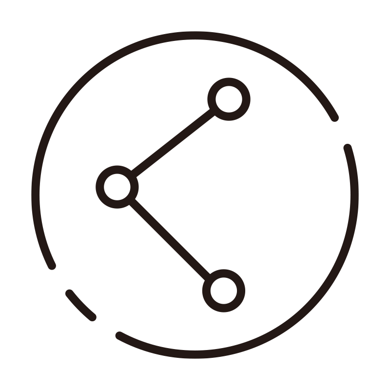 円形の中にネットワークの繋がりを表現した、シンプルなシェア用アイコン素材です。白地に黒のラインで描かれたクリーンなデザインは、SNSへの共有ボタンやコミュニティサイトのロゴなど、現代的なWebサービスに欠かせないパーツです。ミニマルな造形のため、アプリのUIや名刺、パンフレットといった印刷物まで、媒体を問わず幅広くご使用いただけます。