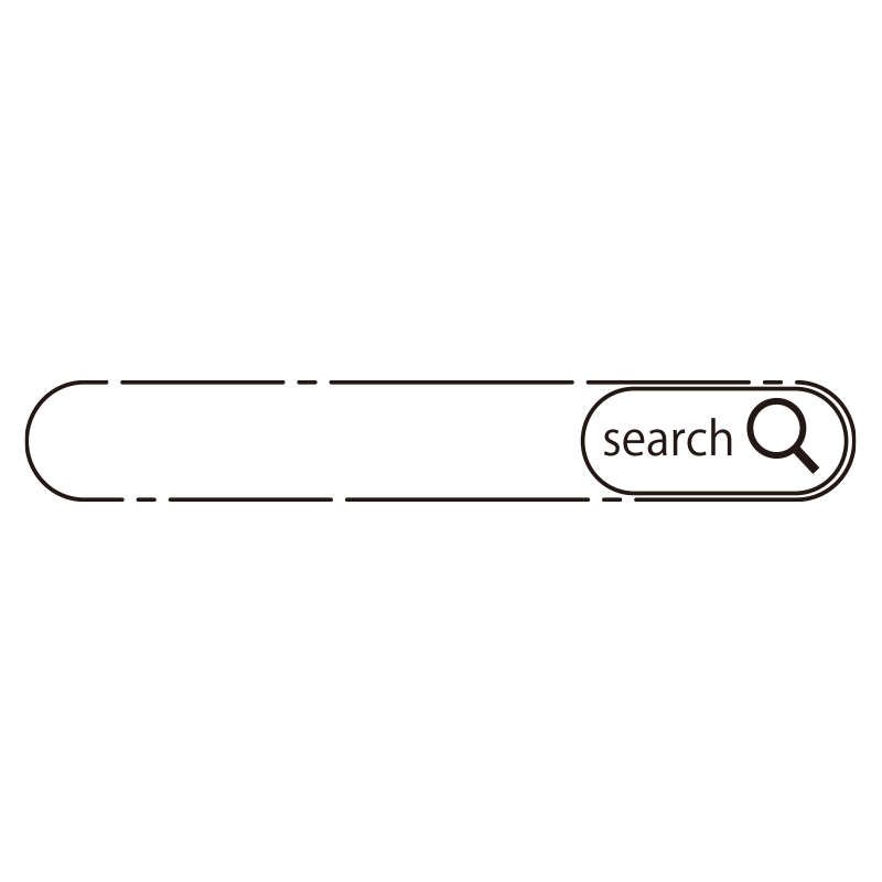 角が丸いモダンなデザインの検索窓(サーチバー)のイラスト素材です。右側のボタン部分に「search」の文字と虫眼鏡のアイコンがセットになっており、WebサイトのヘッダーやアプリのUI設計において、直感的なユーザー体験を演出するパーツとして活用いただけます。