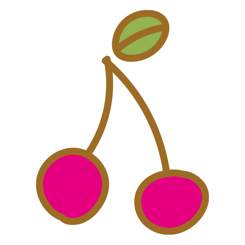 ビビッドなピンク色が鮮やかな、二つ連なったさくらんぼのイラストです。手書き感のあるラフなラインと、一枚の葉っぱがアクセントになっており、フルーツショップのポップ