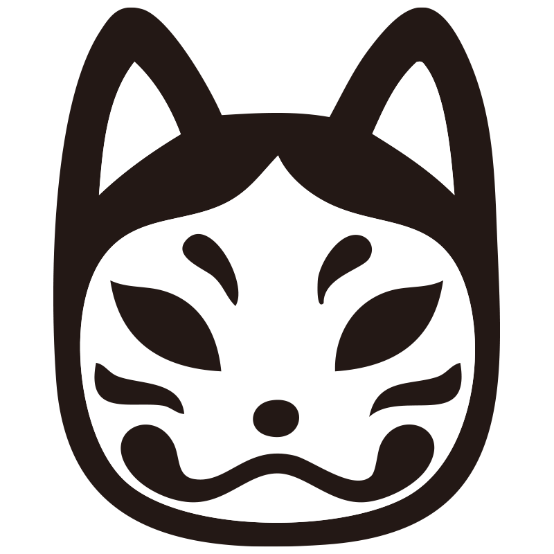 日本の伝統的なお祭りを象徴する、狐(きつね)のお面をモチーフにしたモノクロのシルエットイラストです。和風のデザインや、夏祭り、神社のイベント、伝統芸能を紹介する