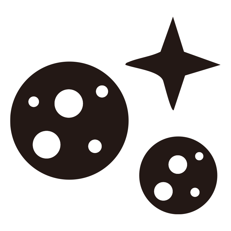 輪を持つ惑星やクレーターのある月など、夜空に浮かぶ天体をキャラクター化したモノクロシルエットイラストです。にっこりとした表情が添えられており、教育用コンテンツや、子供部屋のインテリア雑貨のデザイン、ファンタジーな世界観を演出する装飾パーツと