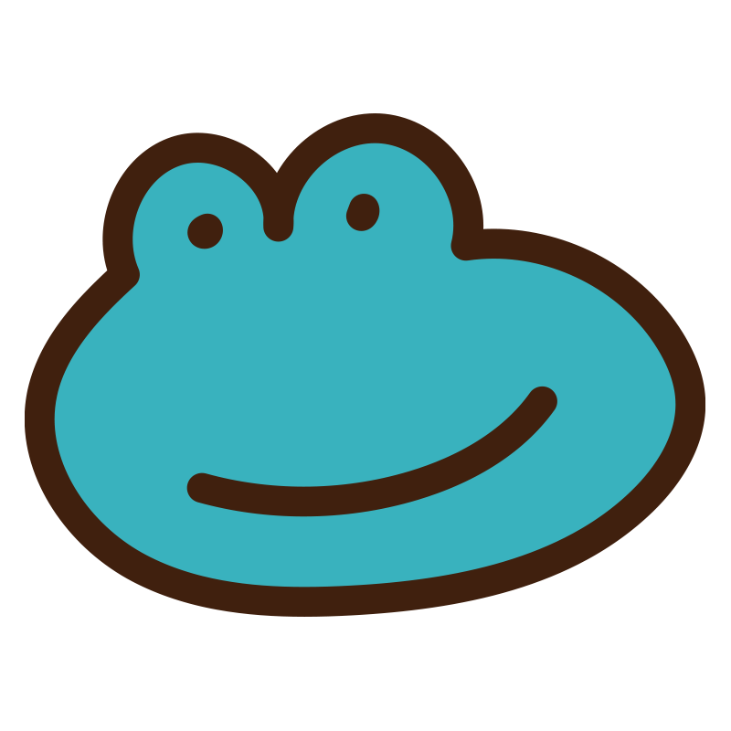 水色の肌とにっこりとした笑顔が特徴的な、カエルの顔のキャラクターイラストです。梅雨の季節や雨の日のコンテンツ、自然、生き物図鑑、お子様向けの教材など、親しみやすさを重視したいシーンに最適です。ゆるいタッチが癒やしを与えます。