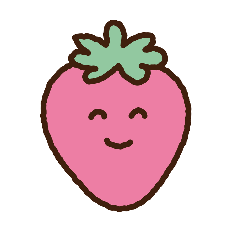 にっこりと微笑む表情が描かれた、手書き風の可愛らしい苺のイラスト素材です。ピンク色の果実と淡いグリーンのヘタが、優しく温かみのある雰囲気を演出しています。子供向けの教材や、お菓子作りのレシピ、春のイベントを告知するチラシのワンポイント素材として、幅広くお使いいただけるデザインです。