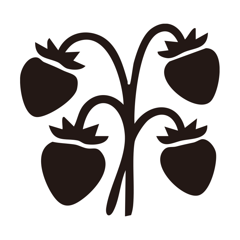 細い茎に実った4つのいちごを、シンプルで可愛らしいシルエットで描いたイラスト素材です。自然ななり口を表現しており、春の訪れやフルーツ狩り、家庭菜園をテーマにした