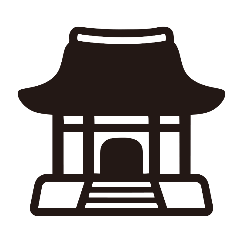寺院を描いたシンプルなモノクロシルエットアイコンです。視認性の高いミニマルなデザインで、背景透過PNG形式のため、資料やWebサイト、SNSの図解などへ即座に配置可能。ロゴやスタンプ素材としても汎用性が高く、媒体を問わずスタイリッシュに馴染みます。