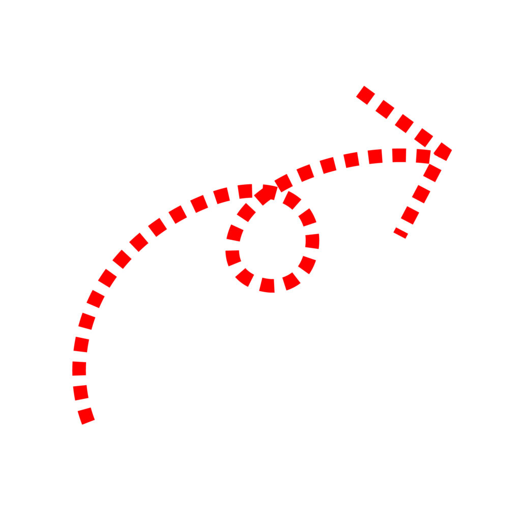 赤色の点線のくるっとした矢印・太め(矢印・arrow・カーブ矢印・循環・リピート)アイコン素材です。Webサイト、SNS投稿、プレゼン資料、チラシやPOP、掲示