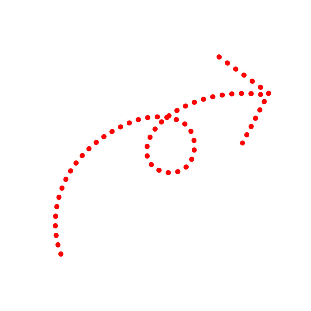 赤色の点線のくるっとした矢印(矢印・arrow・カーブ矢印・循環・リピート)アイコン素材です。シンプルなドットで、Webサイト、SNS投稿、プレゼン資料、チラシ