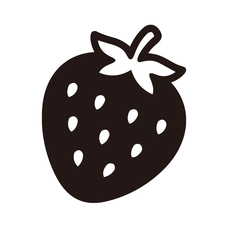 いちごを描いたシンプルなモノクロシルエットアイコンです。視認性の高いミニマルなデザイン で、背景透過PNG形式のため、資料やWebサイト、SNSの図解などへ即座