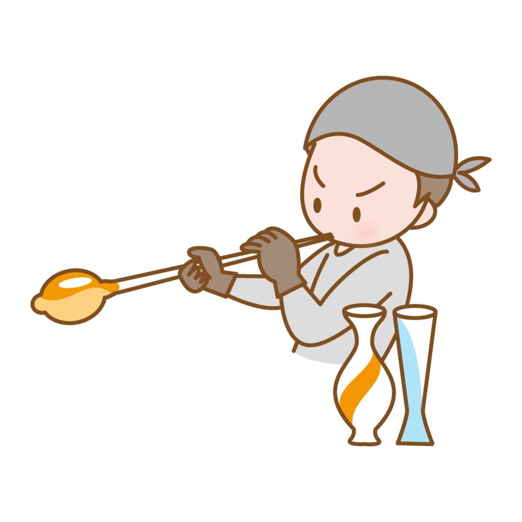 いろいろな職業のイラストです。 ガラス職人の男性のイラストです。 工場でガラス製品を制作する真剣な様子です。 ワンポイントイラストにご利用いただければと思います