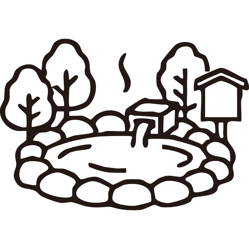 露天風呂描いたシンプルなモノクロシルエットアイコンです。視認性の高いミニマルなデザインで、背景透過PNG形式のため、資料やWebサイト、SNSの図解などへ即座に配置可能。
