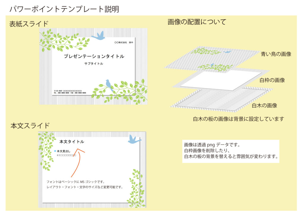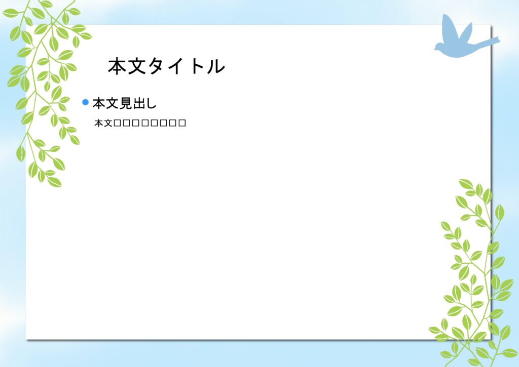 学校の校内ポスターや病院内の掲示物作成におすすめのパワーポイントのテンプレートになります。青く爽やかな空の上を青い鳥が飛ぶ、かわいいデザインです。