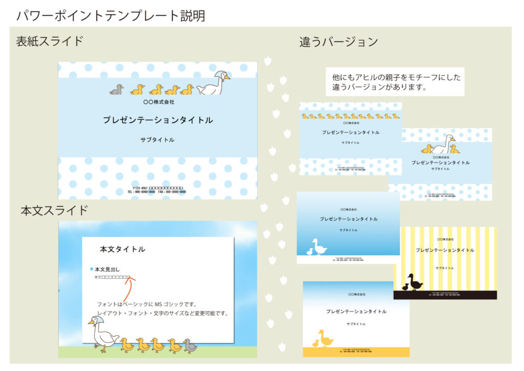 幼稚園、小学校、児童向き、未就学児向けの資料作成におすすめ! アヒルが連なる、かわいいパワポのテンプレートになります。